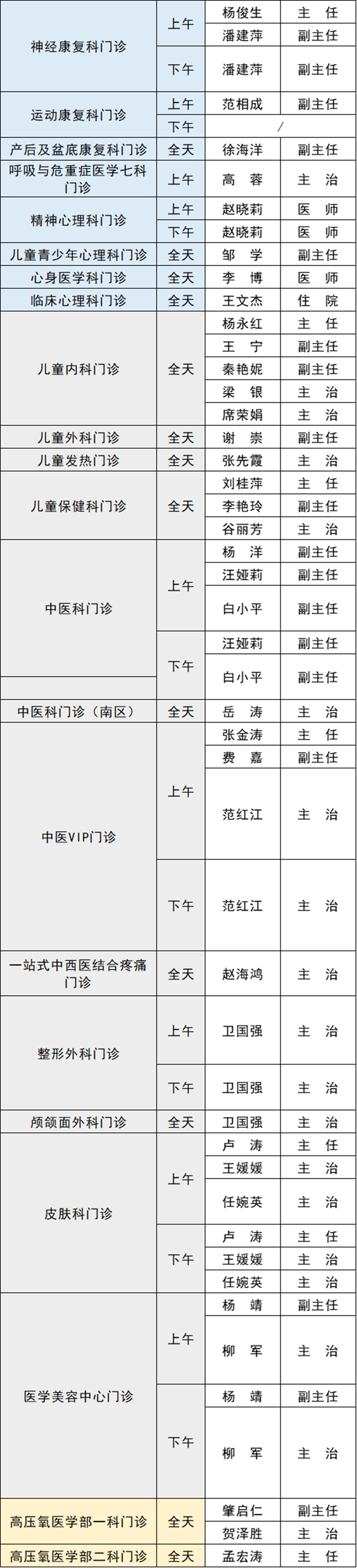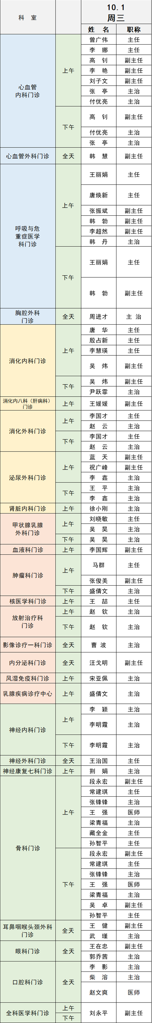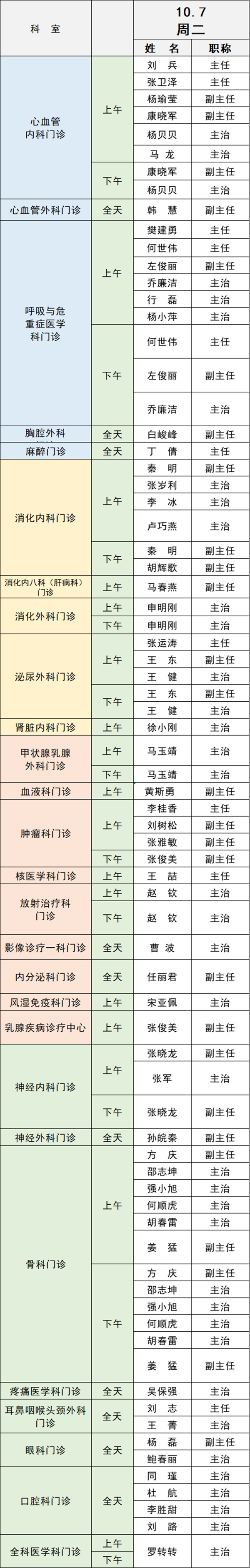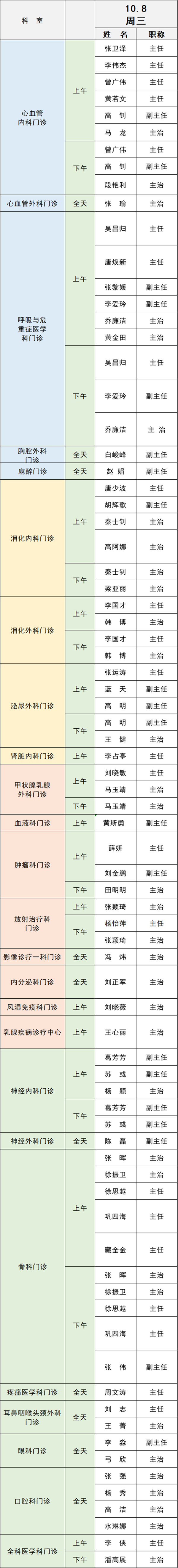 備注:實(shí)際出診情況以醫(yī)院掛號(hào)平臺(tái)實(shí)時(shí)信息為準(zhǔn)。“職稱(chēng)”欄里主任=主任醫(yī)師副主任=副主任醫(yī)師主治=主治醫(yī)師