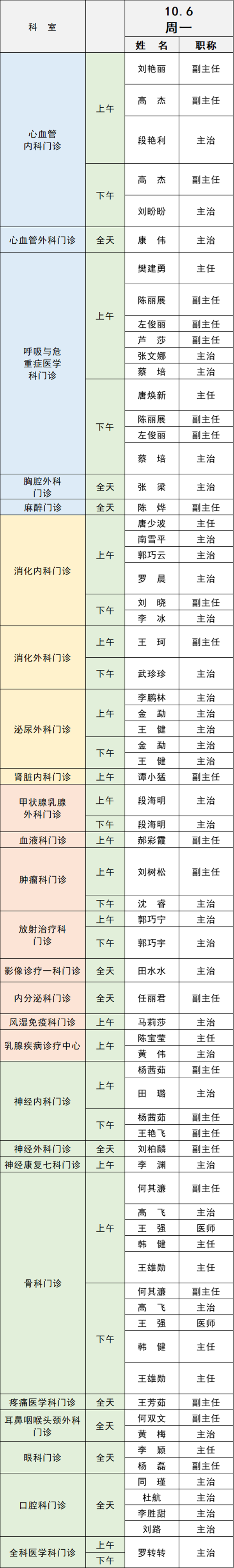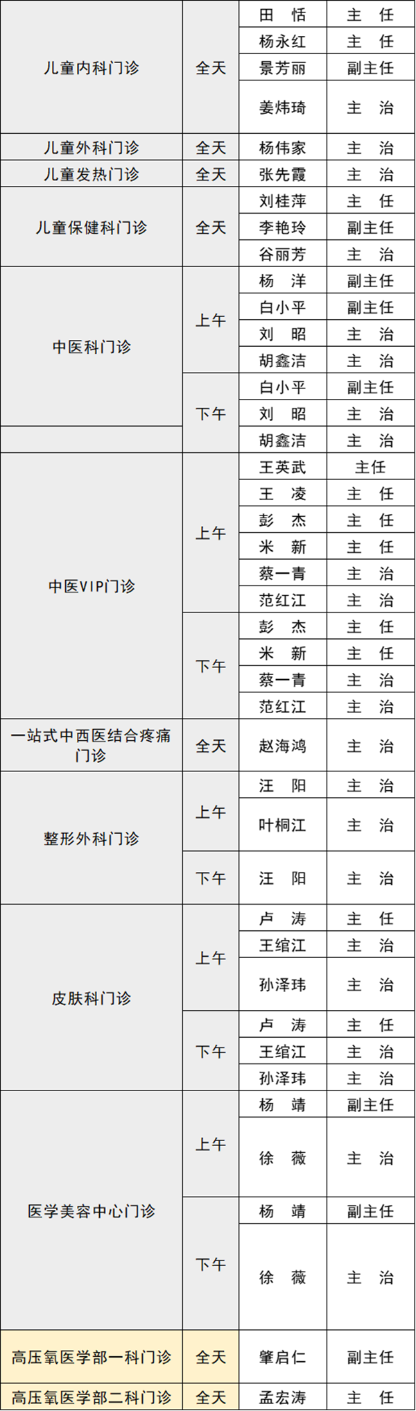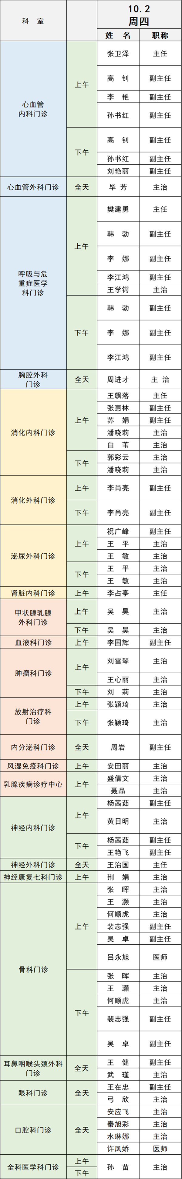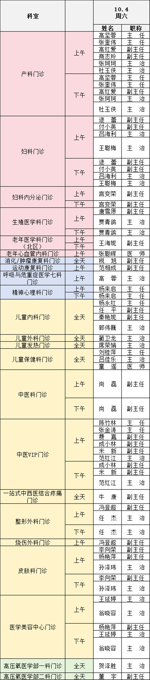 備注:實(shí)際出診情況以醫(yī)院掛號(hào)平臺(tái)實(shí)時(shí)信息為準(zhǔn)。“職稱(chēng)”欄里主任=主任醫(yī)師副主任=副主任醫(yī)師主治=主治醫(yī)師